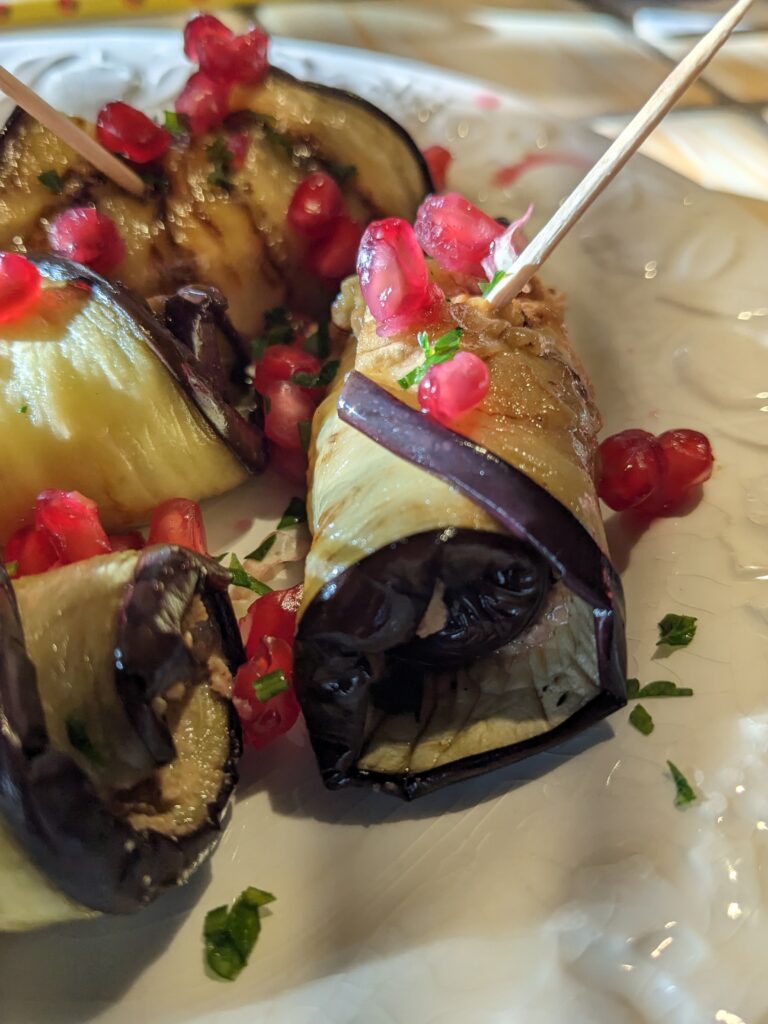 Last Saturday we were invited to Leszek and Ewelina’s. There was a lot of good food on their table, 2 types of curry, steamed rice, some chicken for meat lovers, naan bread that made me squeak, as mine is never that good and there were also those beauties. They were already on the table when we arrived, the toothpicks made it easy to pick up and enjoy. They were my favourite thing we have eaten that evening, I asked for a recipe and then also found it on the internet. Just like Leszek said, it is a Georgian dish, veggie, healthy, good for you. Pretty and tasty. I made it last night and ended up scoffing most of it by myself, as husband claimed the texture of aubergines made them ….challenging. Ma che cazzata!! 🙂