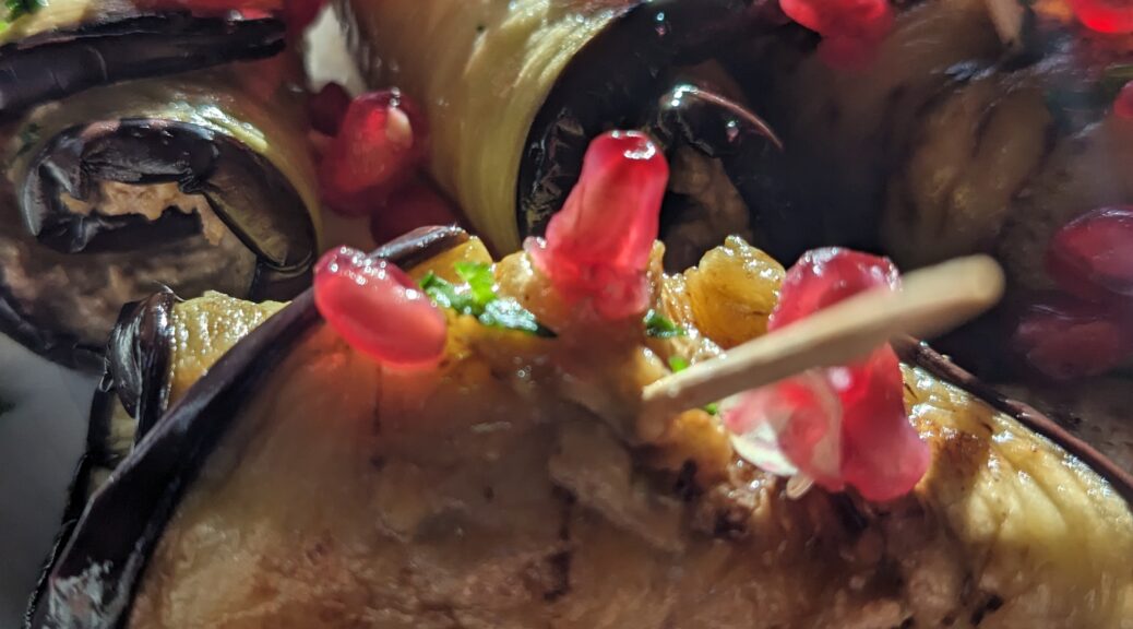 Thinly sliced aubergines were first salted and left to sweat for half an hour before being dried off and fried. The stuffing I’ve made a tiny bit differently. The original recipe and the one at Leszek’s used raw walnuts, I simply can’t stop myself from toasting them, there is so much more flavour after 10 minutes of gentle heat! They were then blitzed with a shallot, some garlic ( maybe a bit too much, I decided afterwards), fresh coriander, a pinch of chili and paprika, salt and all this creamed with a good splash of water to make it into a paste. Spread on the aubergine slices, rolled up, stitched with a toothpick and finished off with fresh pomegranate seeds and more fresh coriander. 10 out of 10 for me and I will be making them in a couple of weeks for a planned dinner party. Might play around with a completely different filling.
