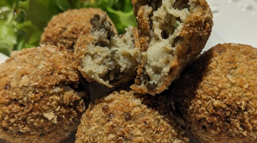 Once formed in cute little polpette I rolled them in breabcrumbs again and they waited in the fridge for dinner. Deep fried until golden, sprinkled with salt before serving, also a fresh green salad and a dip made of Greek yoghurt, cucumber and mint went well together. I’m thinking they would make a great antipasto, maybe even with guacamole!