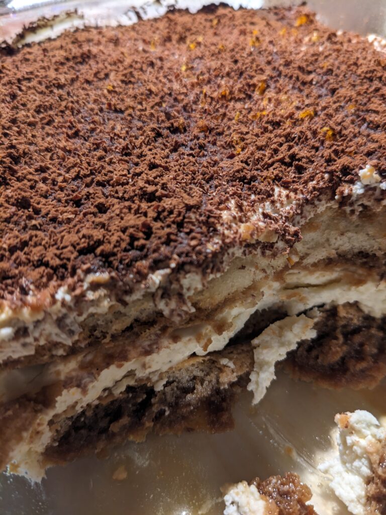 To assemble I also did something new; I used to dip my biscuits in the bowl full of coffee, now I gently poured the sweetened coffee onto the lined up biscuits. Mascarpone Booze Fest on top, more coffee biscuits, more cream. The top layer has a bit more of fresh orange zest, grated dark chocolate and a sprinkling of cocoa.