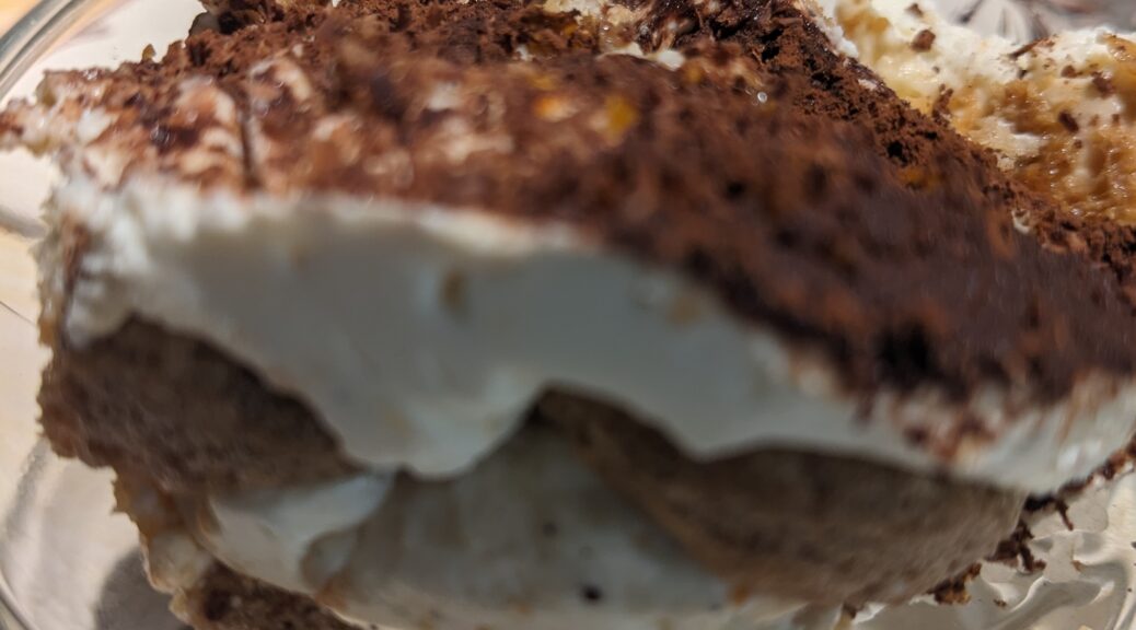 A recipe by Mr Maklowicz, which I simply had to try for many reasons, for example- I don’t have to lose 5kg, so tiramisu is always a good idea, it called for no eggs, a first for me, so I had to try, plus I had all the ingredients at home. And Robert doesn’t really put a foot wrong when it comes to good food, so before lunch earlier today it has been made. And now it’s been tried. Enrico and family will be here tomorrow, I think he should taste it, let’s see what an Italian thinks of that. 🙂