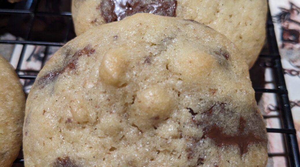 Nice cookies, good combo with a cup of tea, will be packed to school tomorrow to be enjoyed by 11 year olds who don’t have to worry about their waistlines. 🙂