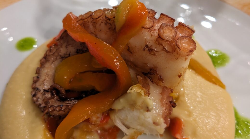 My favourite thing last night was one from the specials board, grilled octopus with chickpea puree, some grilled peppers on the side, I could eat three times as much of it. I think the time will come when I’ll have to master cooking octopus.