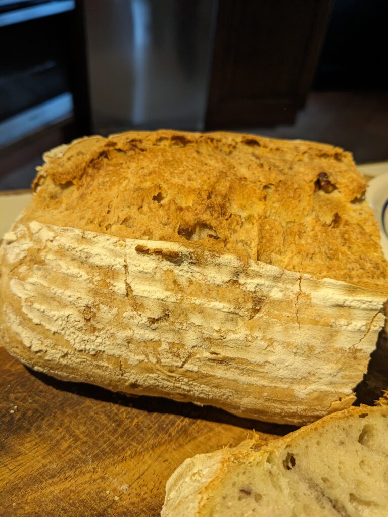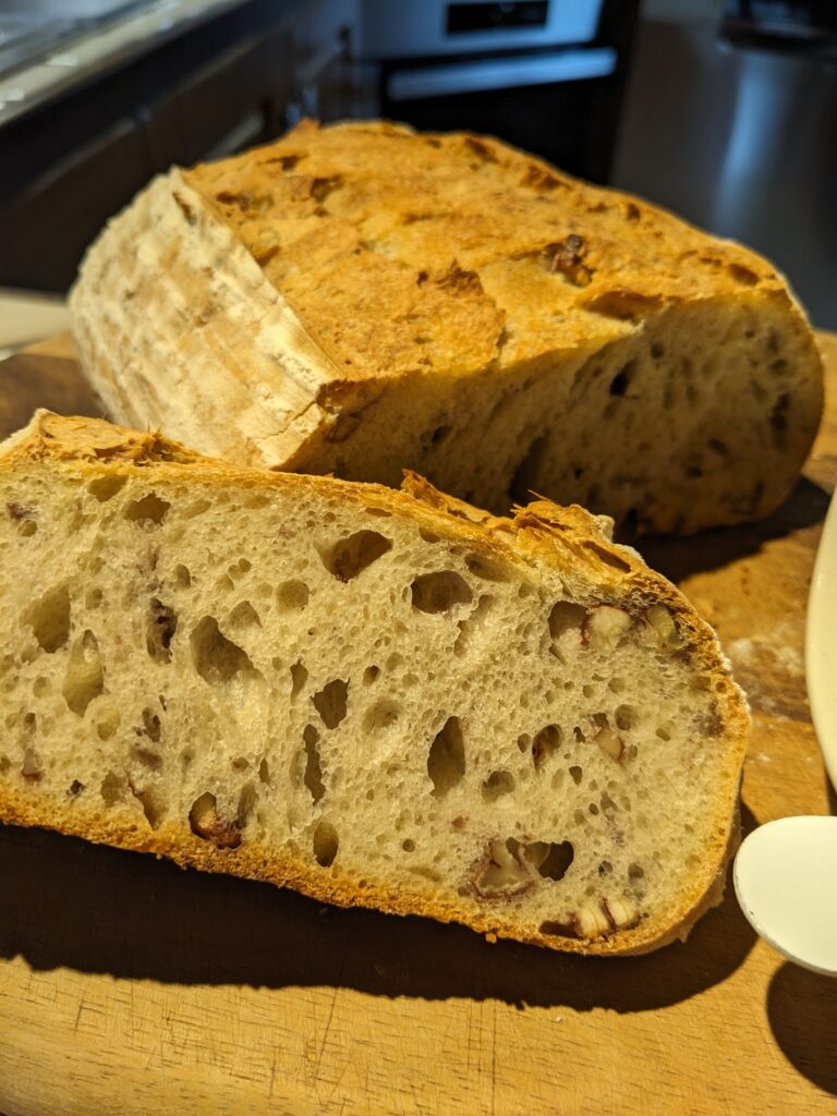 This morning the rise still wasn’t astonishing, but I baked it in 220 degrees in my Dutch oven, 25 minutes under the lid, then 10 minutes without. Also, one long slice , not 2 or 3 across.