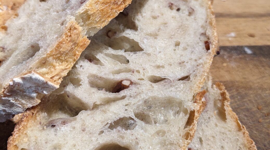 This morning the rise still wasn’t astonishing, but I baked it in 220 degrees in my Dutch oven, 25 minutes under the lid, then 10 minutes without. Also, one long slice , not 2 or 3 across.
