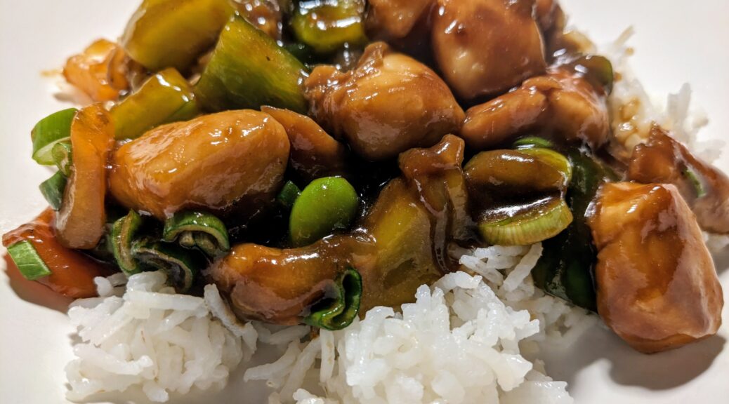 Onto a very hot wok went some oil, roughly chopped onions, quickly caramelised, then the chicken, which I left in piece for about 3 minutes to catch some colour. Some chopped garlic, peppers and a handful of edamame, which I found in Esselunga, miraculously. Finally the stir fry sauce, around the edges, a minute or two, spring onions and we were good to eat.